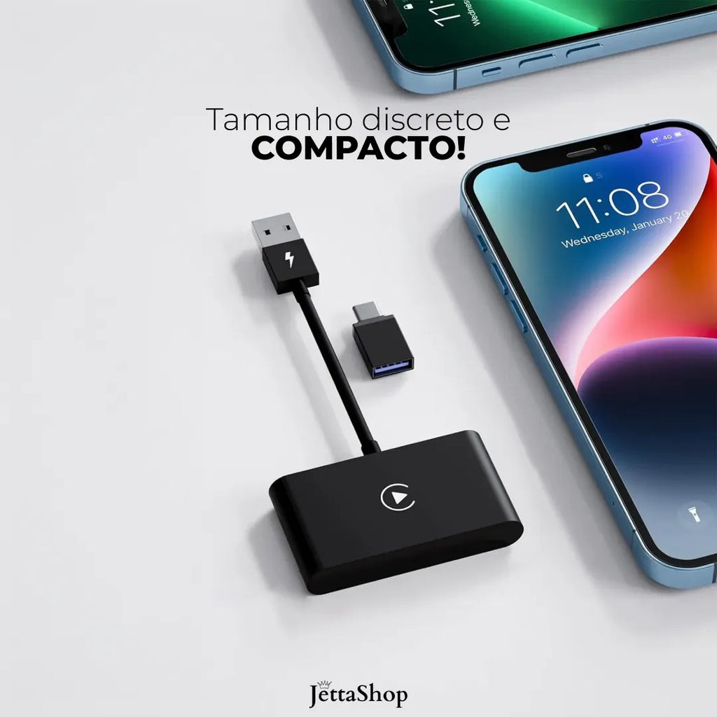 【COMO USAR】- Basta conectar o DriveJetta Ultra™ na porta USB do seu sistema multimídia, e ligar o Bluetooth de seu celular conectado ao adaptador carplay! Imediatamente a tela de seu aparelho será espelhada no multimídia do seu veículo.